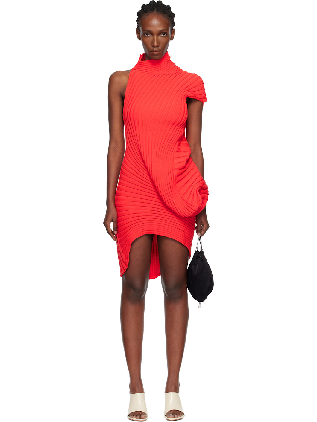 Rib-knit minidress. · Asymmetrical stand collar and hem · Sculptural draping at side seam Supplier color: Red 100% polyester. Made in Japan 252809F052006