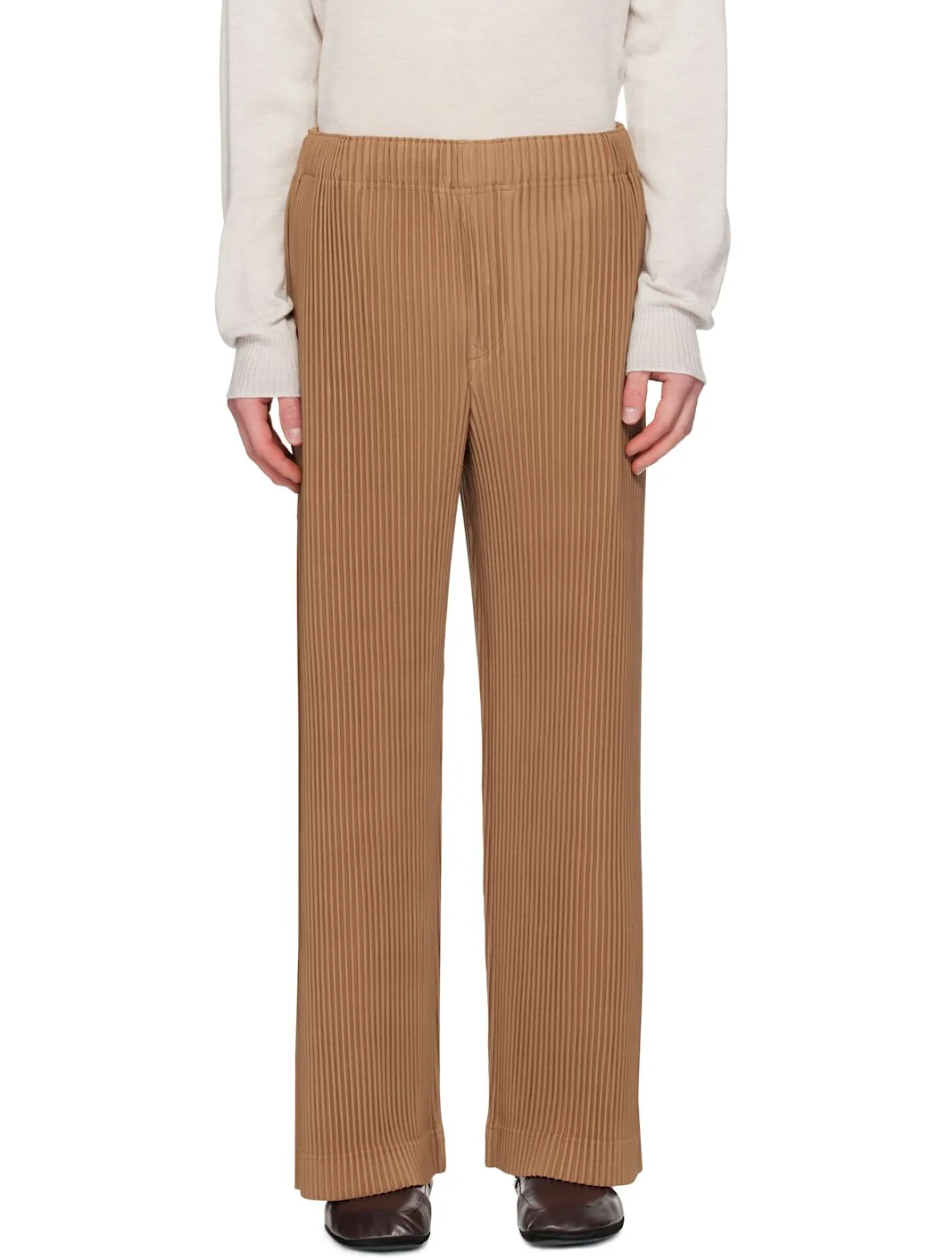 Garment-pleated tricot trousers. · Wide-leg · Mid-rise · Drawstring at elasticized waistband · Two-pocket styling · Button fly Supplier color: Paesina Brown 100% polyester. Made in Japan 252729M191063