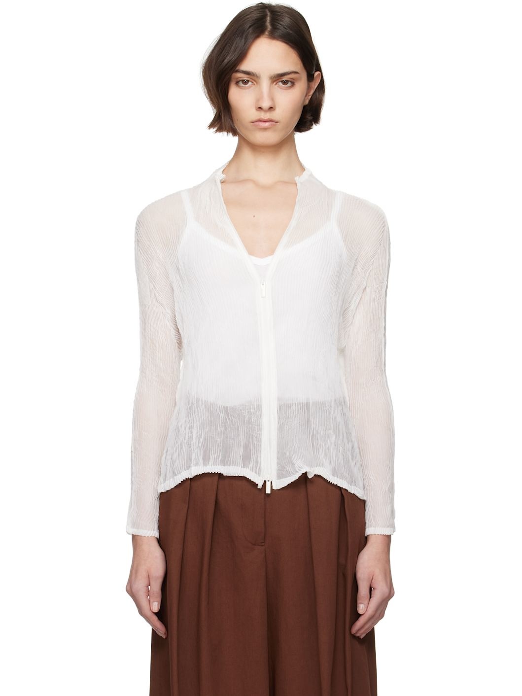 Sheer garment-pleated recycled polyester chiffon blouse. · Mock neck · Two-way zip closure · Dropped shoulders Supplier color: White 100% recycled polyester. Made in Japan 252809F107003