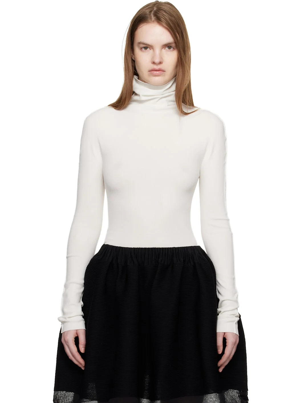 Stretch nylon- and cotton-blend jersey turtleneck. Raw edge at collar, hem, and cuffs. Supplier color: White 60% nylon, 36% cotton, 4% polyurethane. Made in Japan 261809F099005