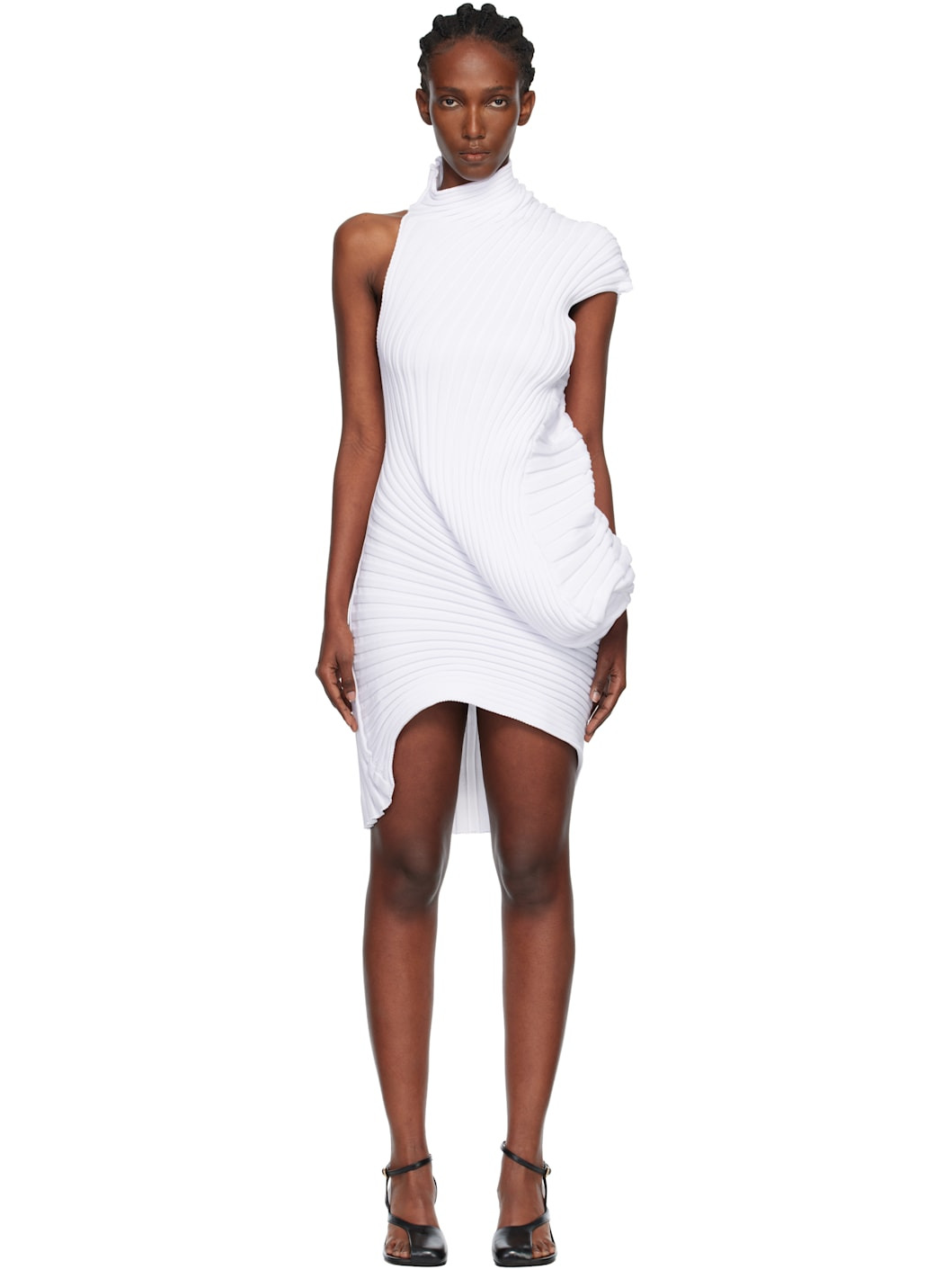 Rib-knit minidress. · Asymmetrical stand collar and hem · Sculptural draping at side seam Supplier color: White 100% polyester. Made in Japan 252809F052007