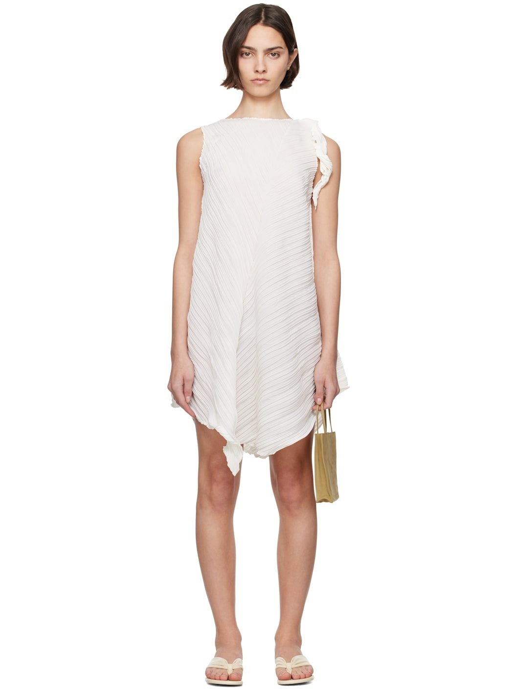 Garment-pleated polyester tricot minidress. · Asymmetric construction · Boatneck · Button fastening and extended trim at shoulder Supplier color: Washi white 100% polyester. Made in Japan 252809F052000
