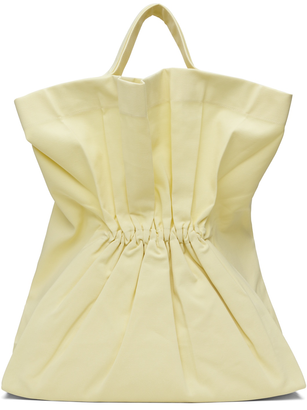 Nylon- and washi paper-blend canvas top handle bag in yellow. · Carry handles · Ruching at face · Open throat · Drawstring pocket at interior · H20" x W17" x D5" Supplier color: Pytalos yellow 52% nylon, 48% paper. Made in Japan 252809F046001