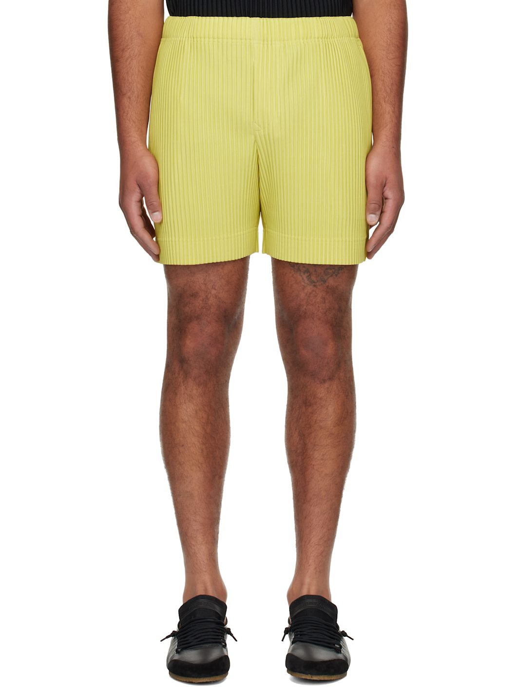 Garment-pleated polyester tricot shorts. · Concealed drawstring at elasticized waistband · Two-pocket styling · Button fly Supplier color: Dusty yellow 100% polyester. Made in Philippines 252729M193013