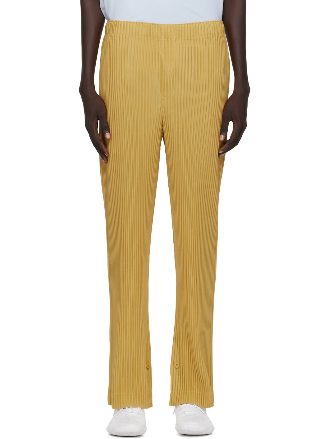 Garment-pleated tricot trousers. · Quick-drying · Straight-leg · Concealed drawstring at elasticized waistband · Two-pocket styling · Button fly · Button vent at inner cuffs Supplier color: Wall yellow 100% polyester. Made in Japan 252729M191009