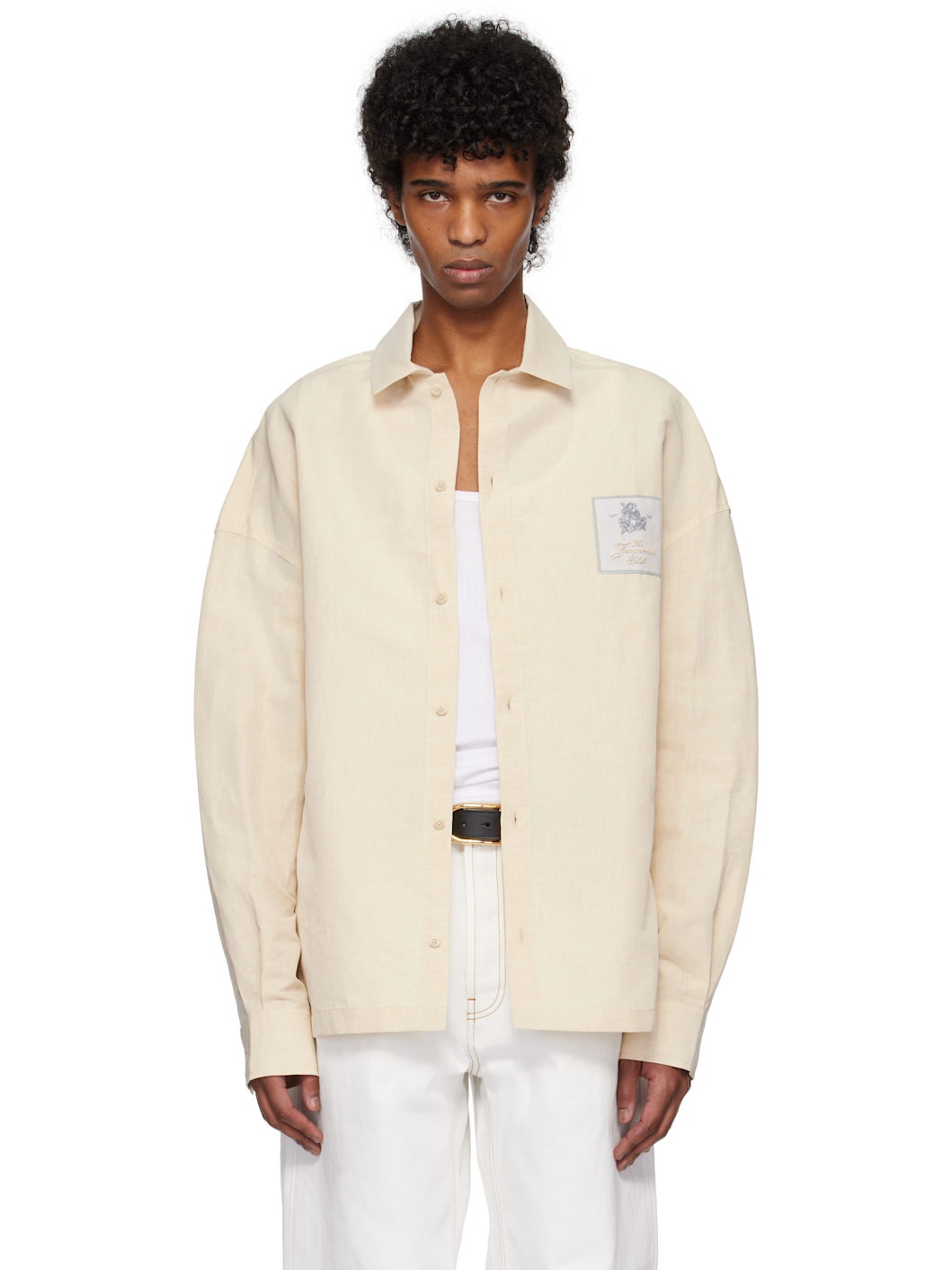 Plain-woven cotton- and linen-blend shirt. · Spread collar · Button closure · Logo graphic patch at chest · Vented side seams · Pleated single-button barrel cuffs · Locker loop at back collar · Logo-engraved hardware Supplier color: Halter off-white 55% linen, 45% cotton. Made in Bulgaria 251553M192030