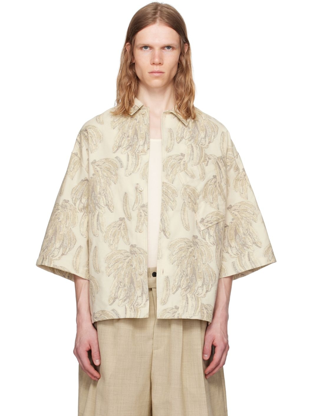 Cotton canvas shirt. Jacquard graphic pattern throughout. · Spread collar · Button closure · Patch pocket at chest · Vented side seams · Locker loop at back yoke · Corozo hardware Part of the La Croisiere collection. Supplier color: Jacquard banana logo ecru 100% cotton. Made in Bulgaria 251553M192019
