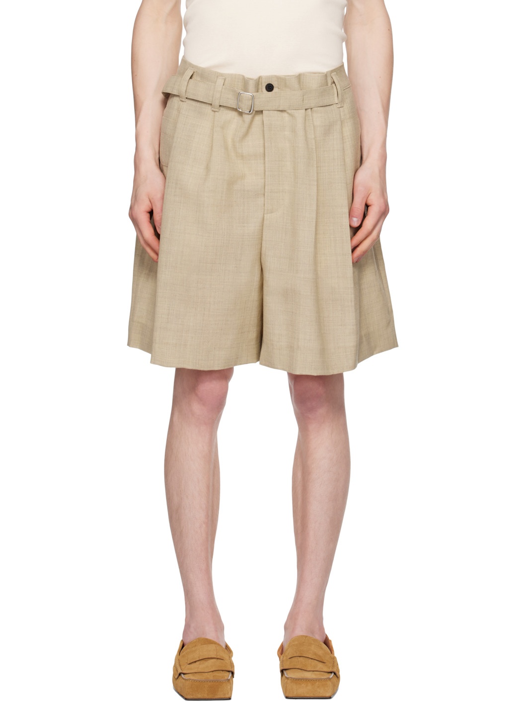 Wool delaine shorts. · Mid-rise · Belt loops and integrated cinch belt · Five-pocket styling · Zip fly · Pleats at front Part of the La Croisiere collection. Supplier color: Beige Body: 100% wool. Lining: 55% cotton, 45% polyester. Made in Romania 251553M193010