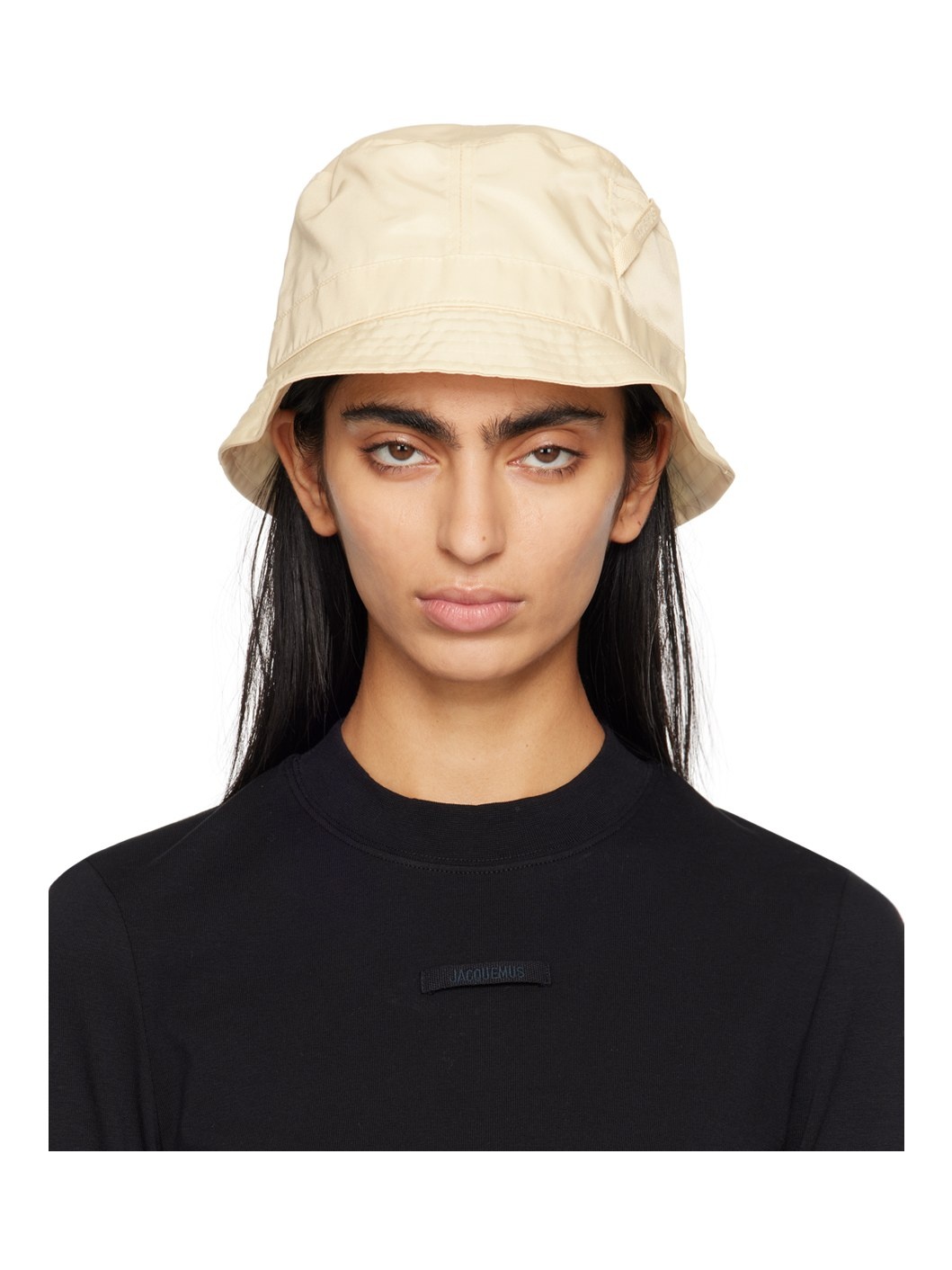 Nylon-blend twill bucket hat in beige. · Embroidered logo flag at face · Quilted brim · Patch pocket at side · Metal eyelets at back face · Cotton poplin lining Part of the Le Chouchou collection. Supplier color: Pale yellow Body: 90% polyamide, 10% acrylic. Lining: 100% cotton. Made in Italy 241553F015010