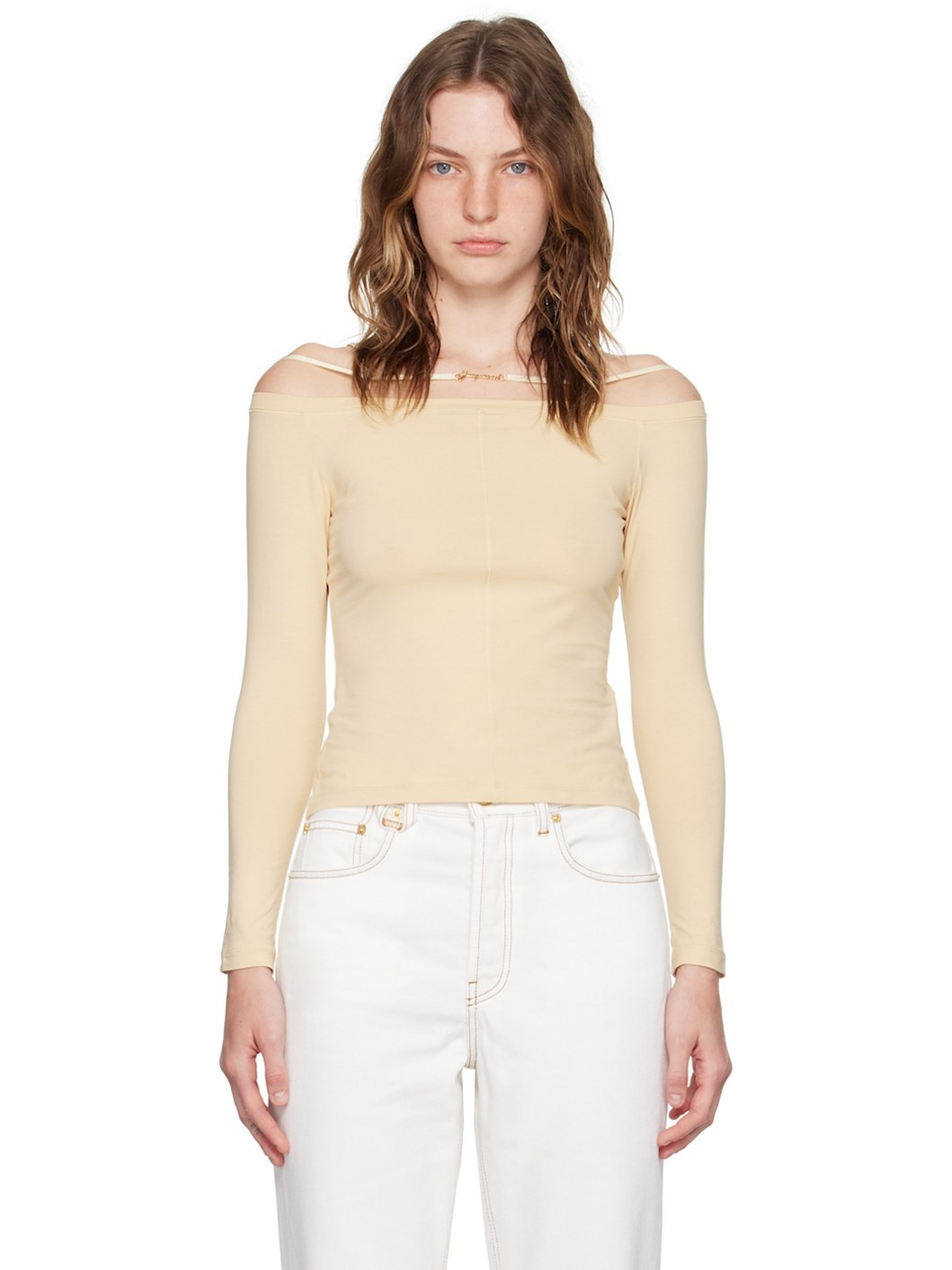 Stretch cotton jersey T-shirt. · Off-the-shoulder construction · Square neck · Logo hardware at chest · Elasticized shoulder straps Supplier color: Light ivory 94% cotton, 6% elastane. Made in Portugal 242553F110021
