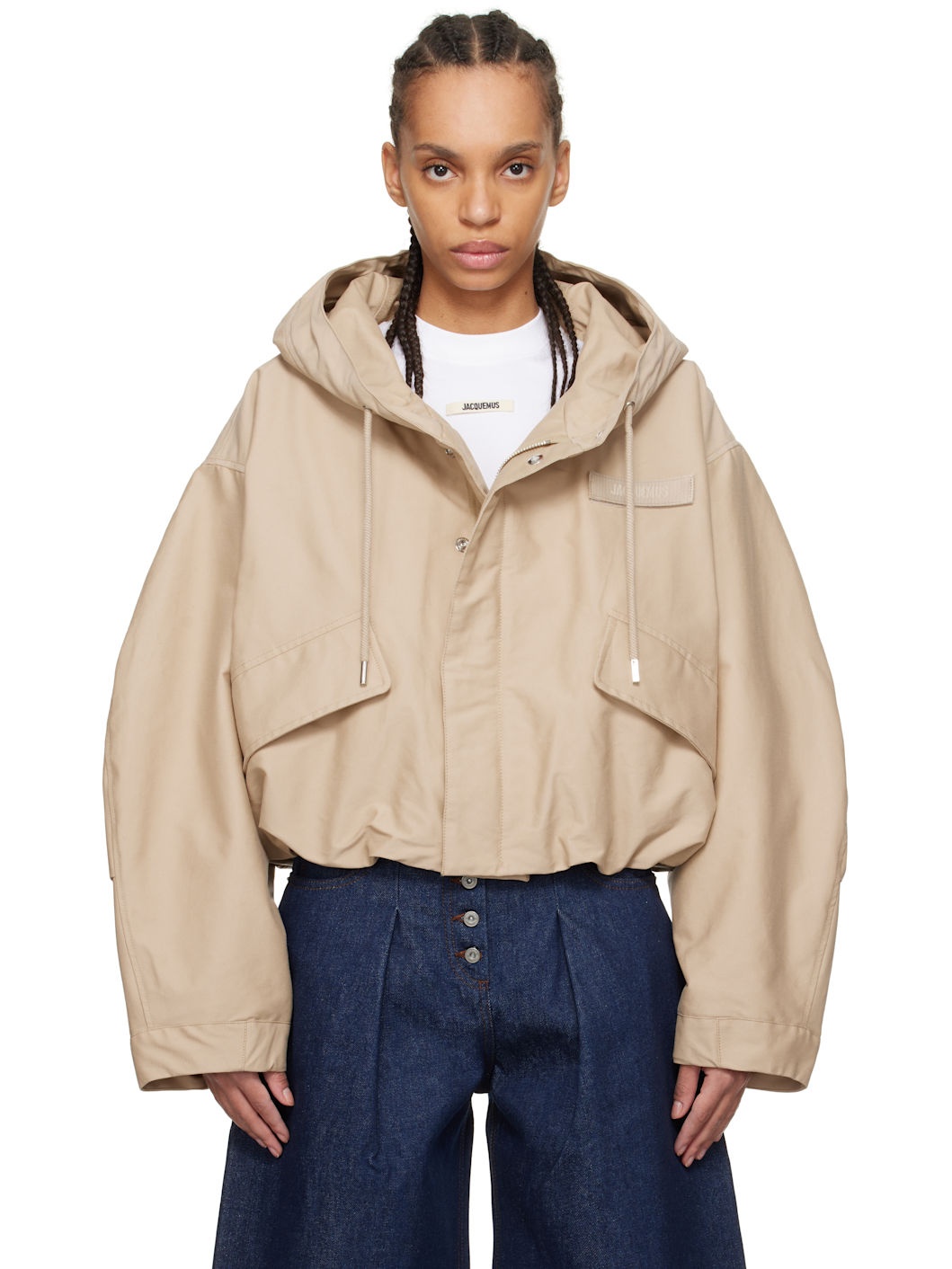 Padded water-repellent cotton canvas jacket. · Drawstring at hood · Concealed zip closure with press-stud placket · Velcro logo patch at chest · Flap pockets · Bungee-style drawstring at cropped hem · Pleats at sleeves · Button tab at cuffs · Nylon satin lining · Logo-engraved silver-tone hardware Supplier color: Beige Body: 74% cotton, 26% polyamide. Lining: 100% polyester. Fill: 100% polyester. Made in Tunisia 251553F063000