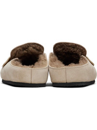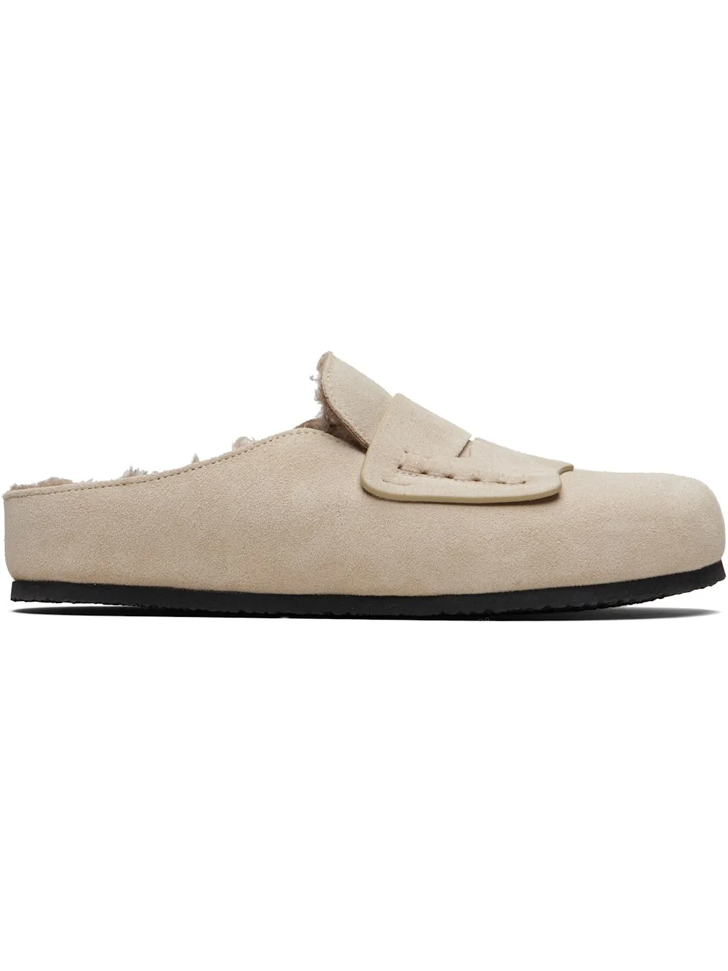 Calfskin suede slip-on loafers. · Strap with cutout at vamp · Shearling lining · Crepe rubber sole Supplier color: Light beige Upper: calfskin. Sole: rubber. Made in Portugal 252553F121001
