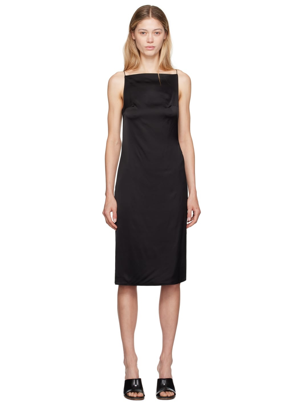 Slim-fit stretch viscose satin dress. · Asymmetrical construction · Square neck · Darts at chest · Concealed zip closure at side seam · Dropped armscye · Spaghetti straps · Logo patch at back collar Part of the La Casa collection. Supplier color: Black 96% viscose, 4% elastane. Made in Romania 242553F052020