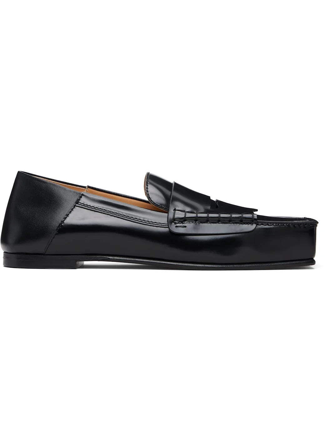 Patent and buffed calfskin loafers. · Square moc toe · Strap with cutout at vamp · Hand-stitched blanket stitching · Collapsible heel counter · Buffed calfskin lining · Stacked heel with rubber injection · Calfskin sole Part of the La Casa collection. Supplier color: Black Calfskin. Made in Italy 261553M231001