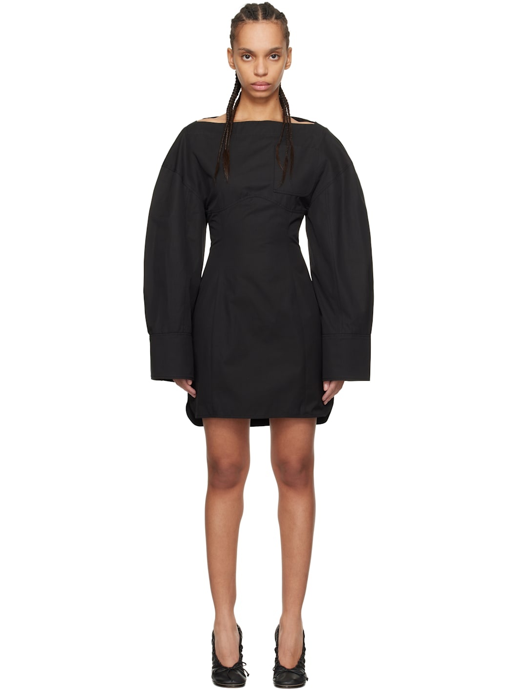 Cotton poplin minidress. · Layered construction · Boat neck · Patch pocket at chest · Vented side seams · Balloon sleeves · Single-button barrel cuffs · Cutout and post-stud strap at back · Zip closure at back · Mother-of-pearl hardware Part of the La Casa collection. Supplier color: Black 100% cotton. Made in Bulgaria 251553F052041