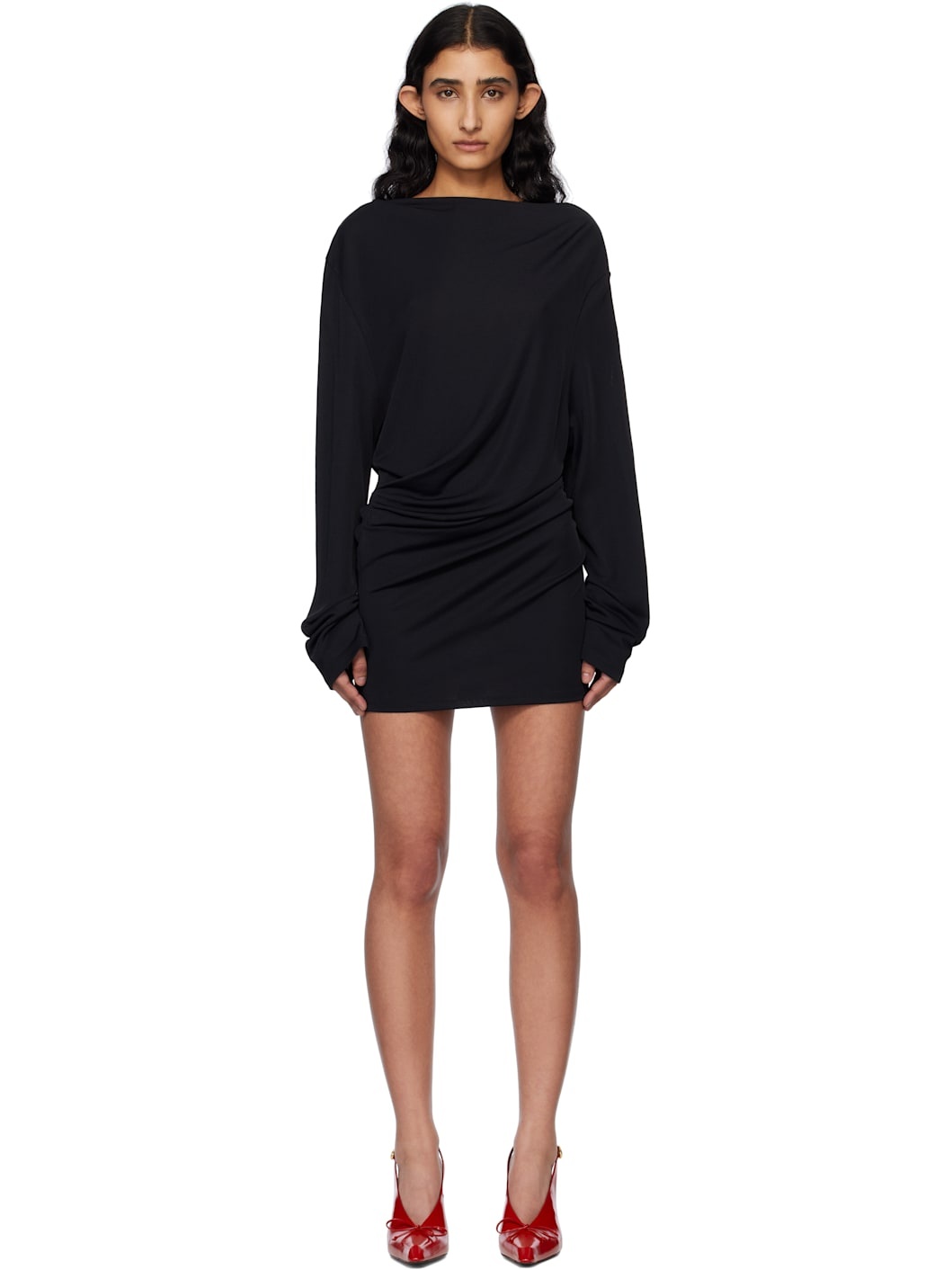Viscose- and nylon-blend jersey minidress. · Boatneck · Gathering at side seam · Asymmetric hem · Draping at low back · Unlined Part of the La Croisiere collection. Supplier color: Black 82% viscose, 18% polyamide. Made in Portugal 251553F052032