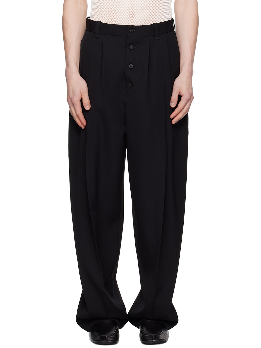 Wide-leg wool twill trousers. · High-rise · Belt loops · Three-pocket styling · Exposed button fly · Pleats at front · Creased legs Part of the La Croisiere collection. Supplier color: Black Body: 100% wool. Lining: 55% cotton, 45% polyester. Made in Bulgaria 251553M191006