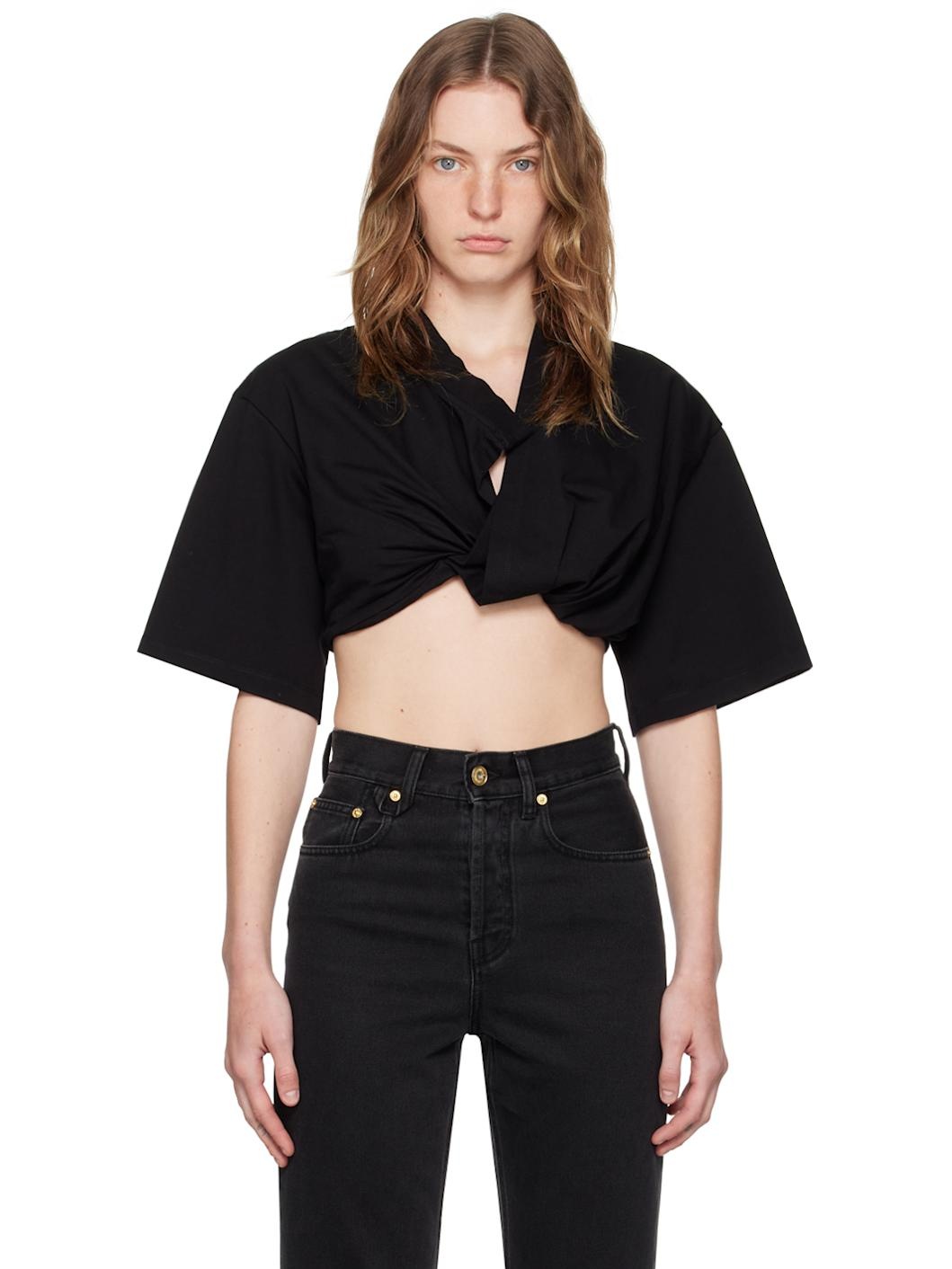 Cotton jersey T-shirt. · Layered construction · V-neck · Twisted detailing and gathering at front · Asymmetric cropped hem · Strap with hook-eye fastening at back · Gold-tone hardware Supplier color: Black 100% cotton. Made in Portugal 242553F110014