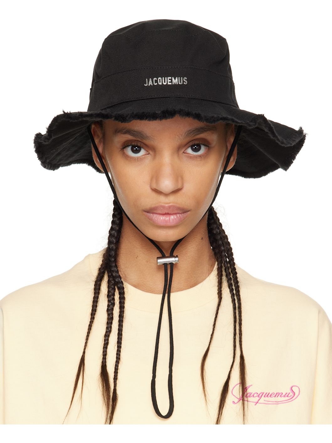 Cotton twill bucket hat in black. · Logo hardware at face · Frayed edge at quilted brim · Cord-lock chin strap · Poplin lining · Logo-engraved silver-tone hardware Part of the Les Classiques collection. Supplier color: Black Body: 100% cotton. Lining: 80% polyester, 20% cotton. Made in Bulgaria 251553F015009
