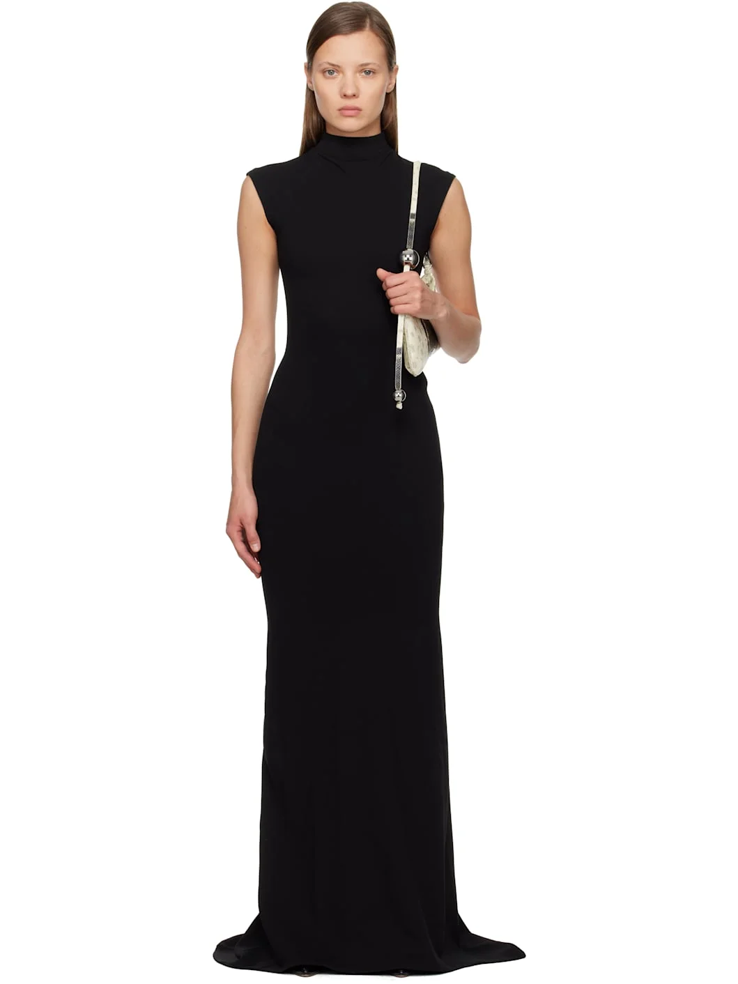 Stretch viscose- and nylon-blend crepe jersey maxi dress. · Mock neck · Cap sleeves · Concealed zip closure at back · Ruching at back · Subtle train hem Supplier color: Black 78% viscose, 16% polyamide, 6% elastane. Made in Portugal 252553F055003