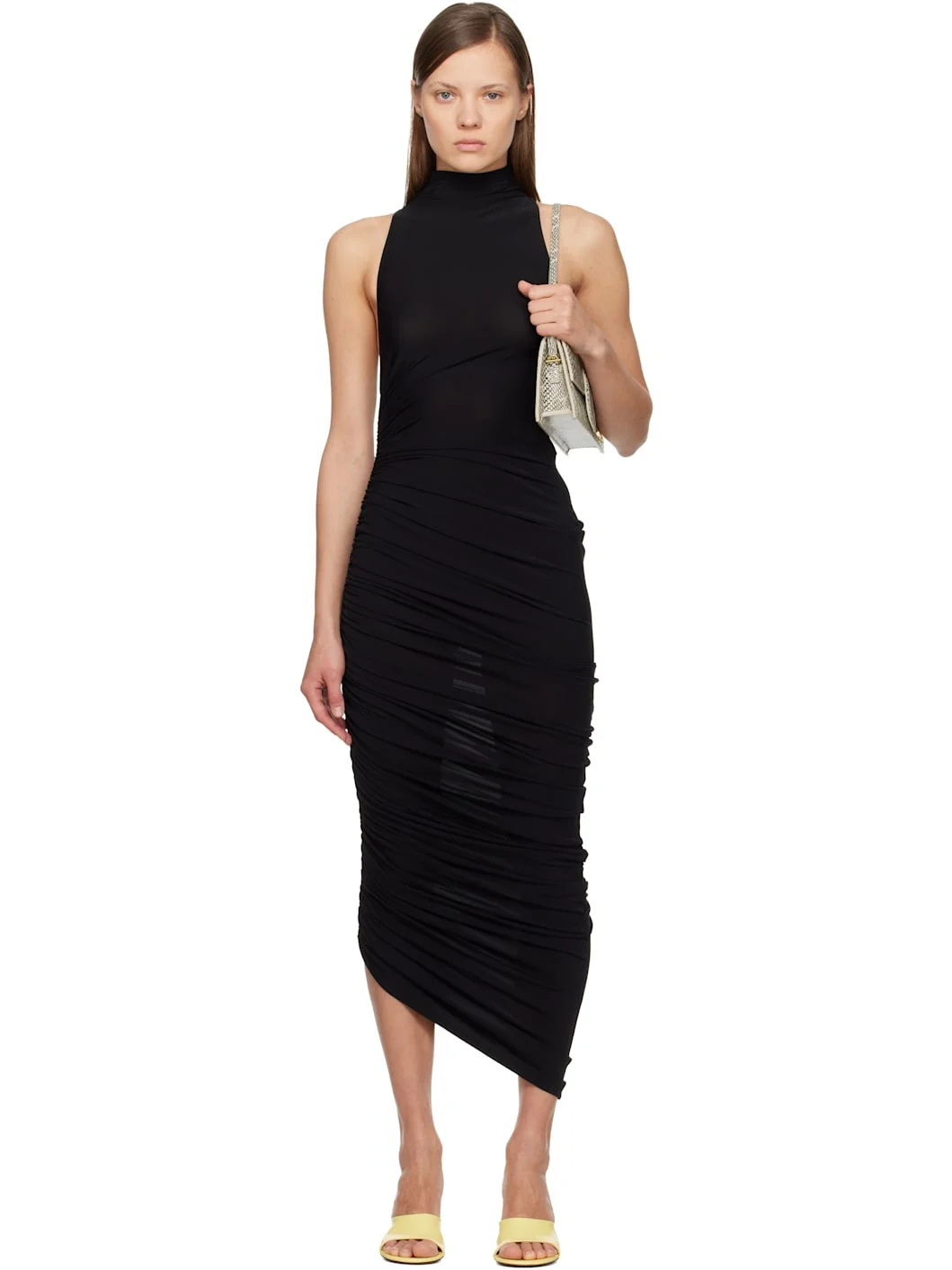 Stretch jersey midi dress. · Ruching throughout · Mock neck · Asymmetric hem · Concealed zip closure at side seam · Buttoned keyhole at back collar Supplier color: Black 75% acetate, 20% polyamide, 5% elastane. Made in Portugal 252553F054004