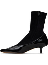 Ankle-high suede and polished leather boots. · Pointed toe · Zip closure at inner side · Twisted covered stiletto heel with rubber injection · Leather sole · Heel: H1.75" Supplier color: Black Upper: leather. Sole: leather, rubber. Made in Italy 252553F113001