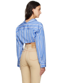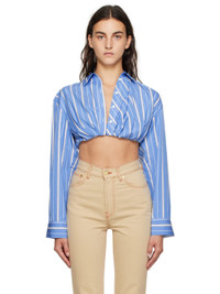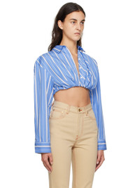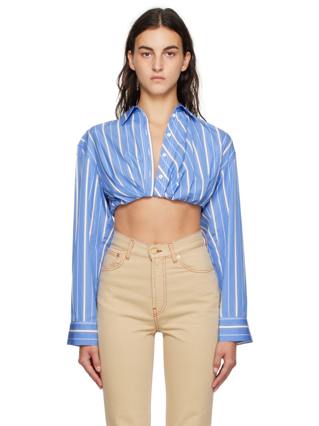 Cotton poplin shirt. Stripes throughout. · Spread collar · Button closure · Twisted detailing at cropped hem · Three-button barrel cuffs · Cutout and elasticized trim at back hem · Cinch strap at interior Part of the Le Chouchou collection. Supplier color: Blue stripes 100% cotton. Made in Bulgaria 232553F109003