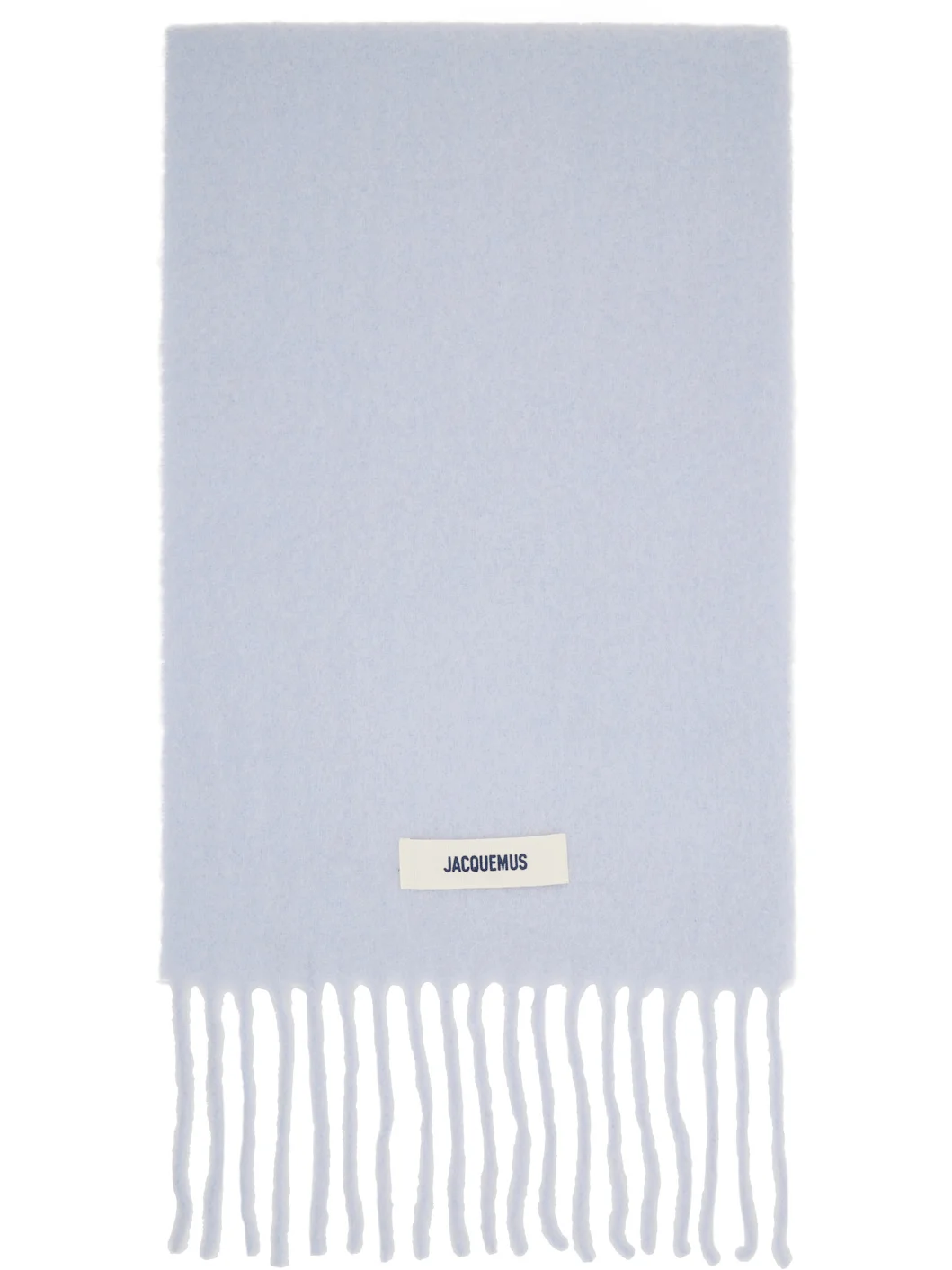 Rectangular brushed knit mohair- and alpaca-blend scarf. · Logo patch at face · Fringed detailing at ends · L112.25" x W15.75" Supplier color: Pale lilac 28% mohair, 28% alpaca, 24% virgin wool, 20% polyamide. Made in Italy 252553F028015