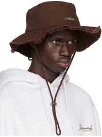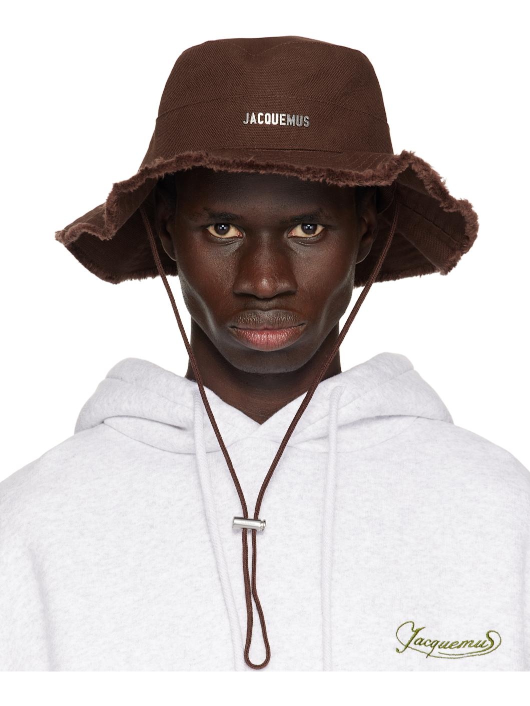 Cotton twill bucket hat in brown. · Logo hardware at face · Frayed edge at quilted brim · Cord-lock chin strap · Poplin lining · Logo-engraved silver-tone hardware Supplier color: Brown Body: 100% cotton. Lining: 80% polyester, 20% cotton. Made in Bulgaria 251553M140010