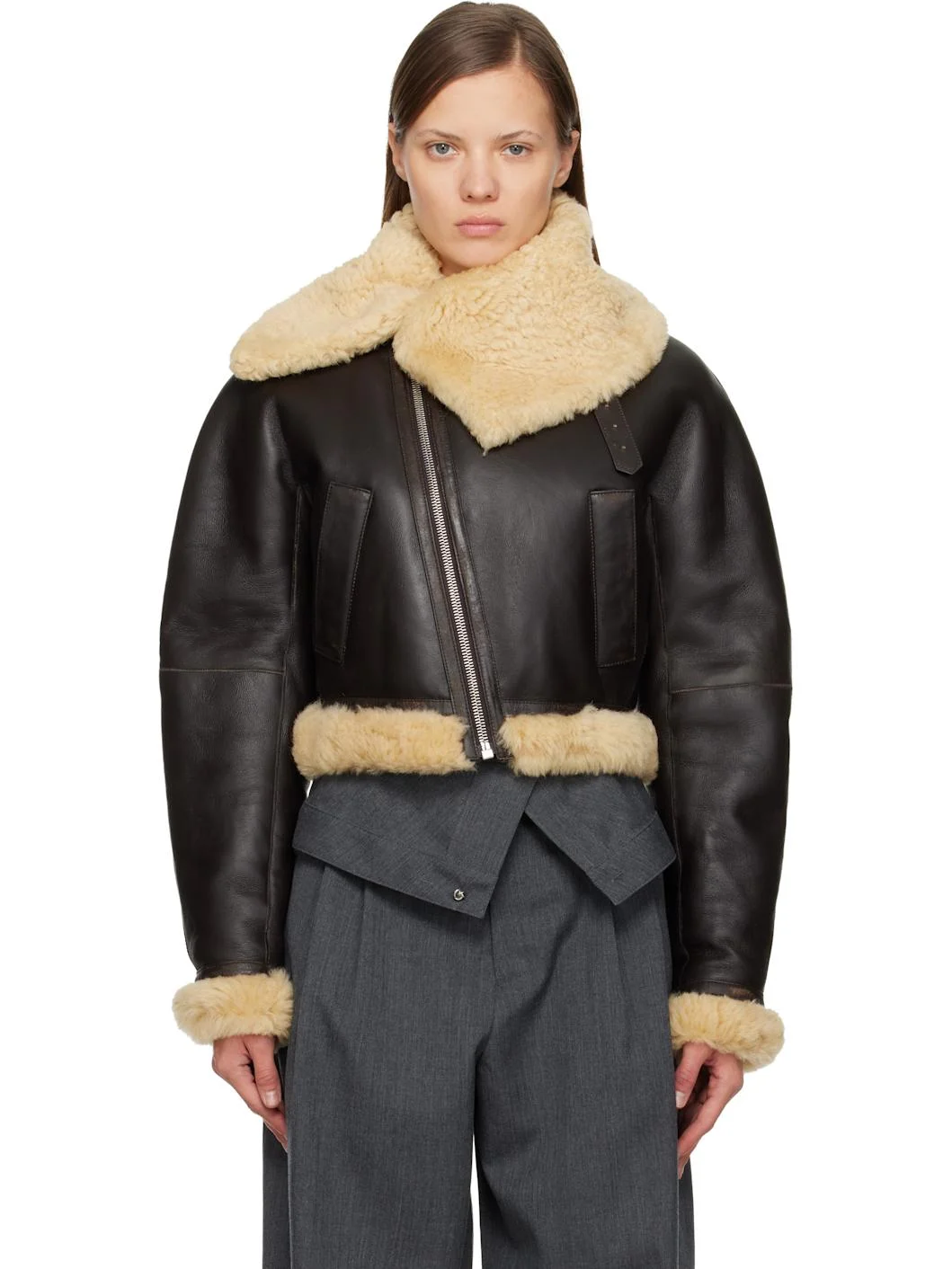 Paneled grained lambskin jacket. · Subtle fading and shearling trim throughout · Pin-buckle tab at sailor collar · Offset zip closure · Welt pockets at front · Cropped hem · Full shearling interior Supplier color: Dark brown 100% lambskin. Made in Turkey 252553F064000