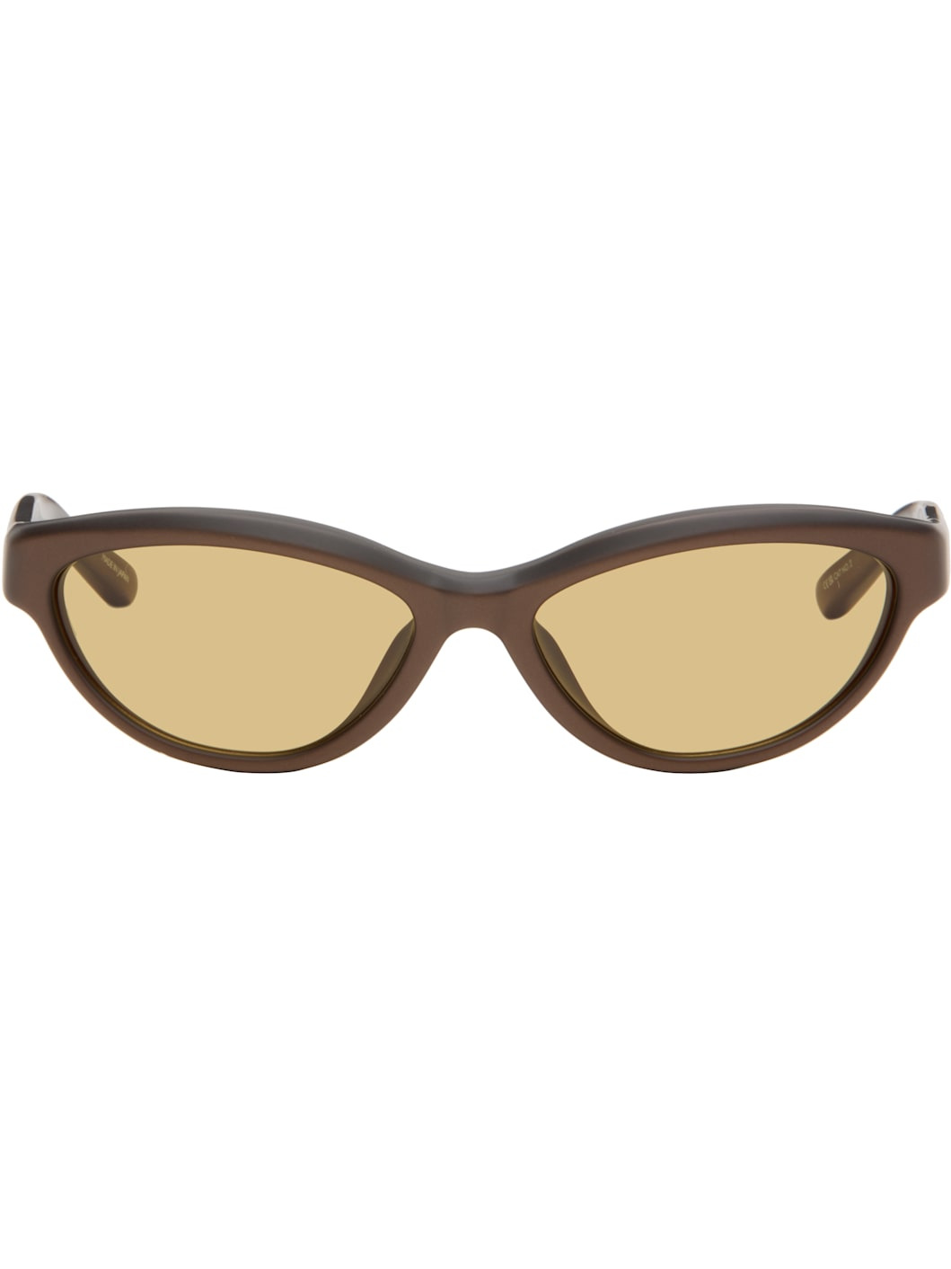 Oval acetate-frame sunglasses. · Yellow lenses · 100% UVA/UVB protection · Integrated nose pads · Logo printed at temples · Includes pouch · Size: 57.16 120 Supplier color: Dark brown matt Acetate. Made in Japan 252553M134008