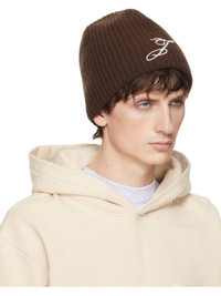 Rib-knit merino wool beanie. Logo embroidered at face. Supplier color: Dark brown 100% merino wool. Made in Italy 252553M138006