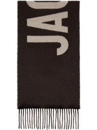 Rectangular knit wool scarf. · Jacquard logo at face · Fringed detailing at ends · L80.25" x W14" Supplier color: Multi-brown 100% wool. Made in Italy 252553F028001