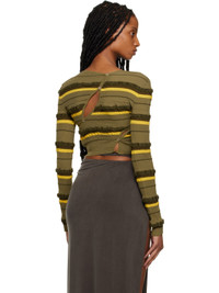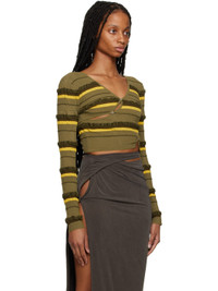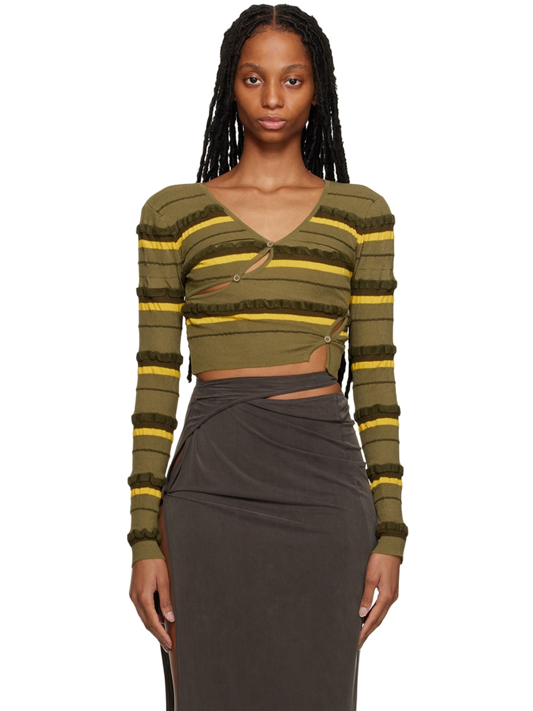 Textured knit stretch nylon- and cotton-blend cardigan. Slits, button detailing, and jacquard stripes throughout. · V-neck · Rib knit cropped hem and cuffs Part of the Le Raphia collection. Supplier color: Dark green 44% polyamide, 30% cotton, 19% recycled polyamide, 7% elastane. Made in Portugal 231553F095008