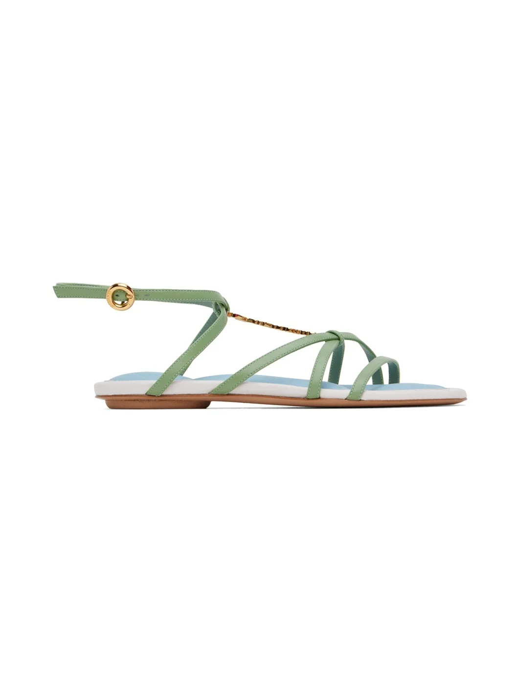 Grained leather sandals in green. · Open round toe · Logo hardware at vamp · Adjustable pin-buckle ankle strap · Sculptural padded footbed · Leather sole Supplier color: Light green