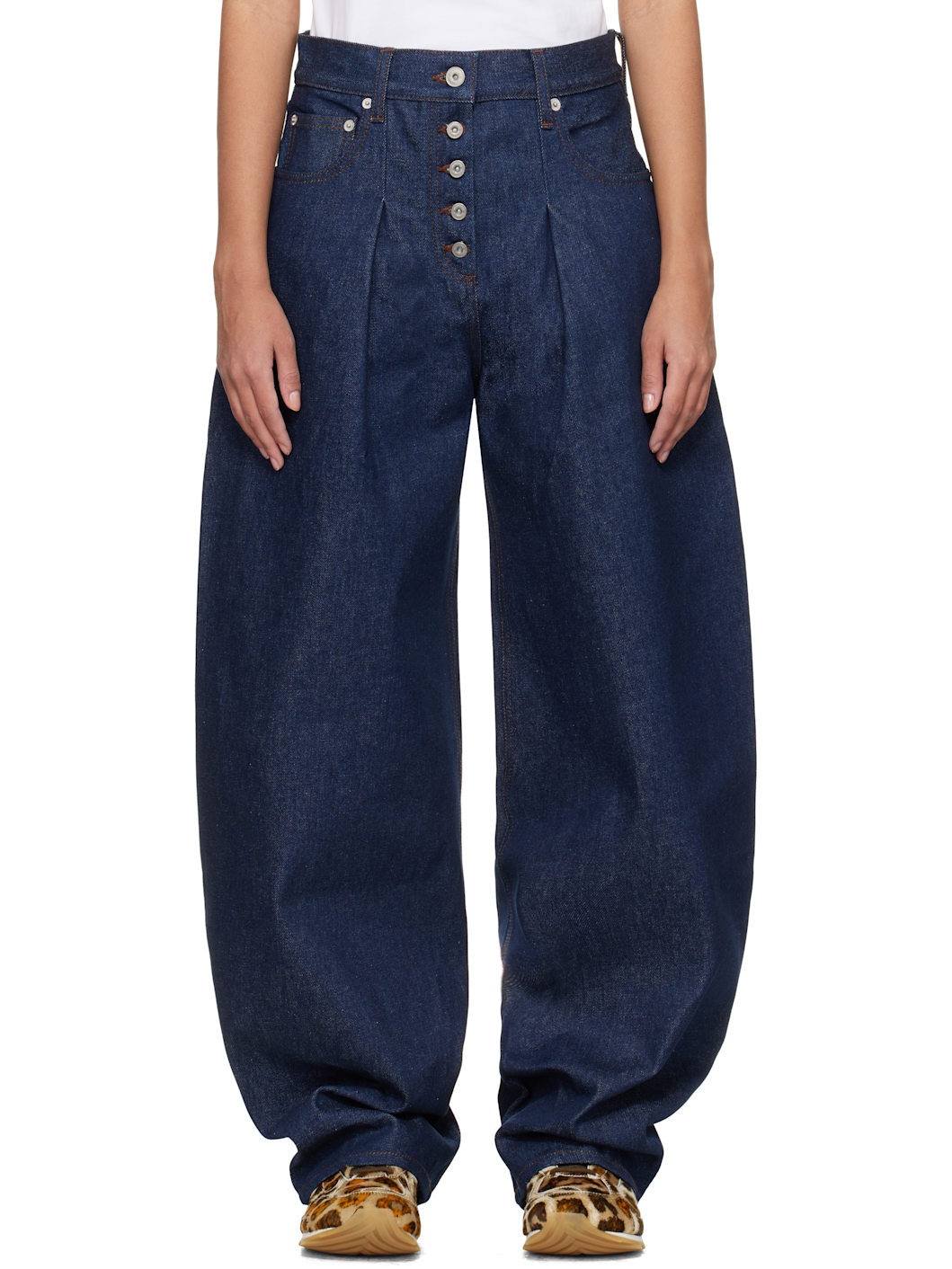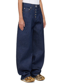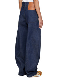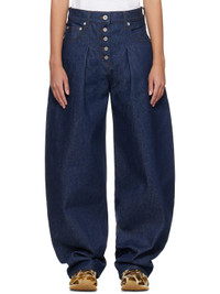 Wide-leg non-stretch denim jeans. · Belt loops · Four-pocket styling · Exposed button fly · Pleats at front · Leather logo patch at back waistband · Logo-engraved silver-tone hardware · Contrast stitching in brown Supplier color: Navy/Brown Body: 100% cotton. Lining: 65% polyester, 35% cotton. Made in Portugal 251553F069016