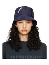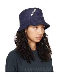 Nylon-blend satin bucket hat in navy. · Patch pocket with logo strap at side · Metal eyelets at side · Quilted brim · Cotton broadcloth lining Supplier color: Navy Body: 90% polyamide, 10% acrylic. Lining: 100% cotton. Made in Italy 241553F015011