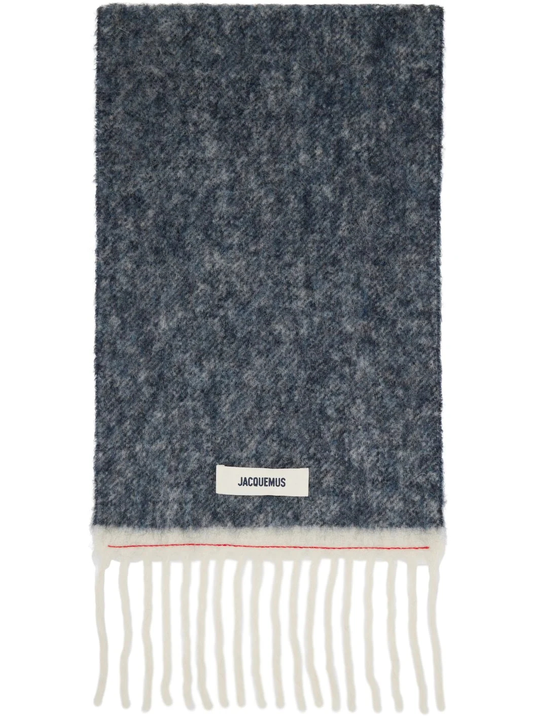 Rectangular brushed knit mohair- and alpaca-blend scarf. · Marling throughout · Logo patch at face · Fringed detailing at ends · L112.25" x W15.75" Supplier color: Navy/White stripe 28% mohair, 28% alpaca, 24% virgin wool, 20% polyamide. Made in Italy 252553F028014