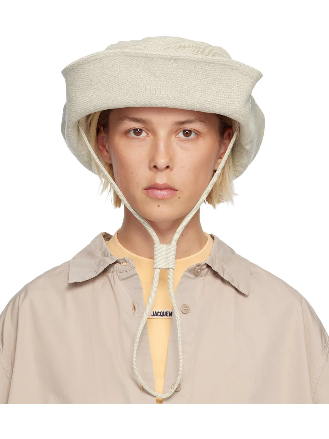 Linen- and cotton-blend denim bucket hat. · Logo hardware at face · Mismatched eyelets at sides · Cinch strap at back · Press-stud fastening at brim · Cord-lock chin strap · Cotton poplin lining · Logo-engraved silver-tone hardware Part of the La Croisiere collection. Supplier color: Off-white Body: 55% linen, 45% cotton. Lining: 100% cotton. Made in Bulgaria 252553F015015