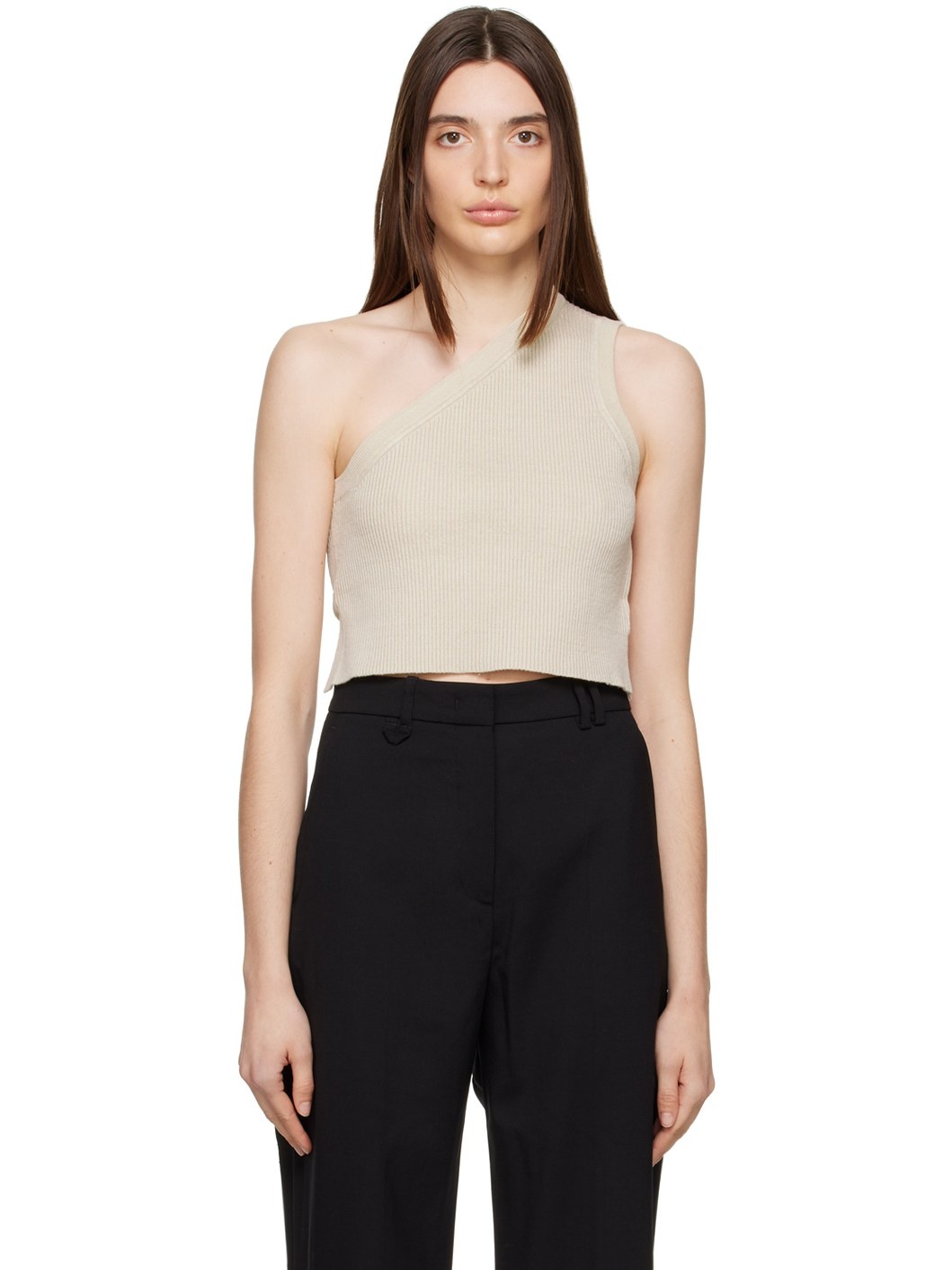 Rib knit stretch linen-blend tank top. · Asymmetric neck · Cropped hem · Adjustable cinch strap at open back Supplier color: Off-white 86% linen, 13% polyamide, 1% elastane. Made in Portugal 231553F111020