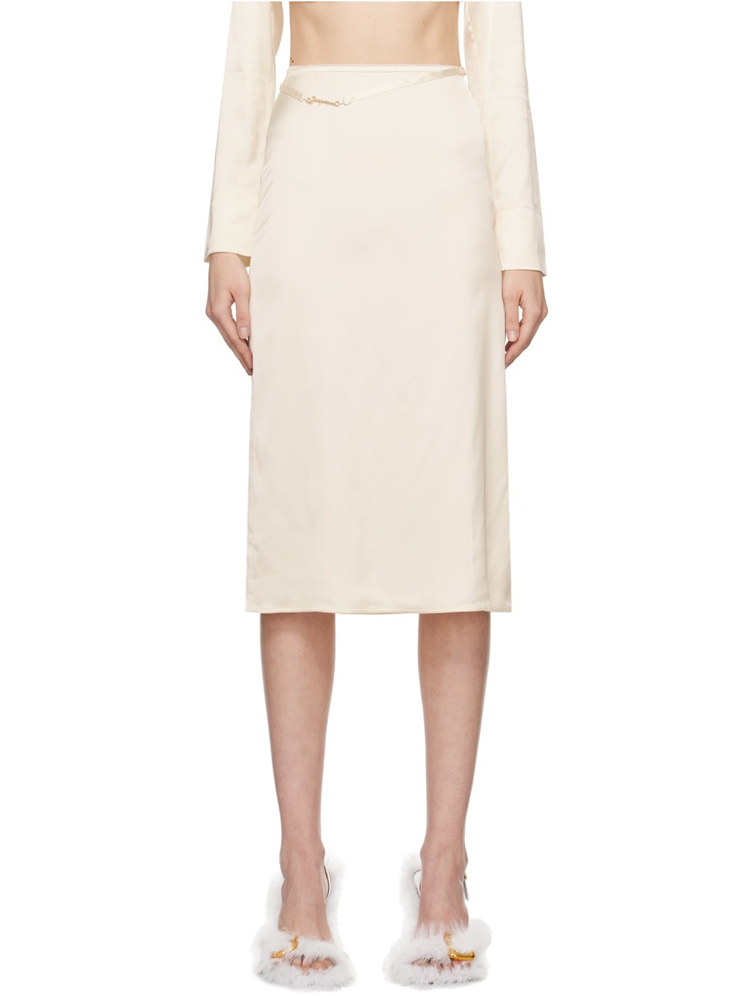 Stretch viscose-blend satin skirt. · Adjustable strap with logo hardware at waist · Scalloped trim at waistband and hem · Zip closure at back · Gold-tone hardware Part of the Le Papier collection. Supplier color: Off-white 96% viscose, 4% elastane. Made in Bulgaria 241553F092006