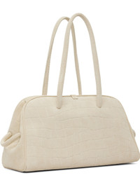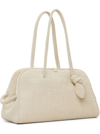 Croc-embossed calfskin suede top handle bag. · Rolled shoulder straps · Knotted detailing at strap base · Logo embossed at face · Strap at sides · Magnetic fastening at top · Zip closure · Zip pocket at interior · Cotton twill lining · H9" x W15" x D7" Supplier color: Ivory Calfskin. Made in Italy 252553F046008