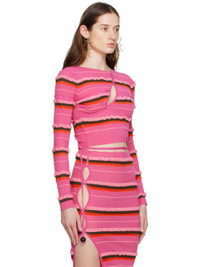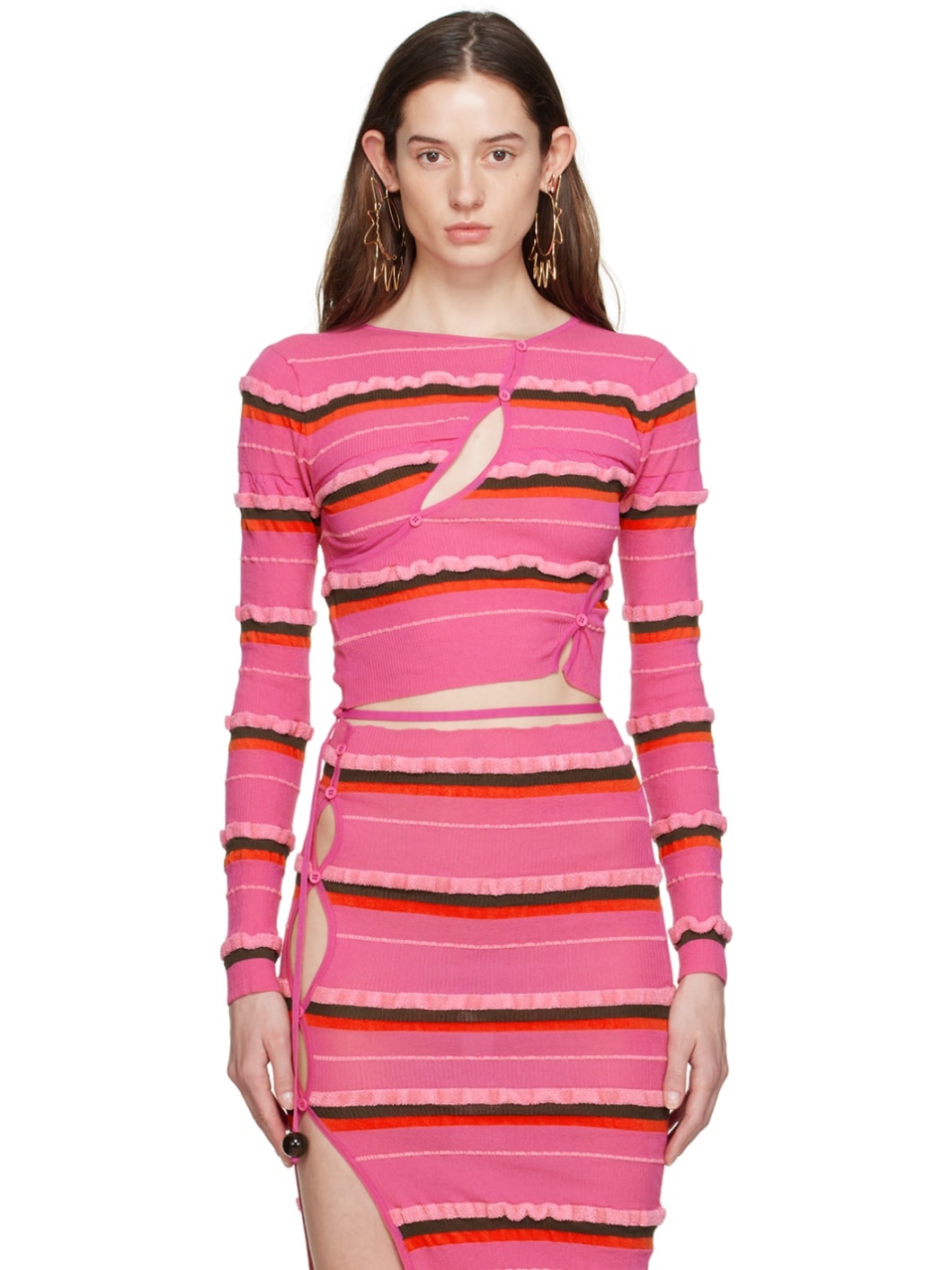 Rib knit stretch nylon and cotton-blend cardigan. Stripe pattern, boucle trim, and button vents throughout. · Paneled and asymmetric construction · Y-neck · Cutouts at front and back · Cropped hem Supplier color: Dark pink 44% polyamide, 30% cotton, 19% recycled polyamide, 7% elastane. Made in Portugal 231553F095007