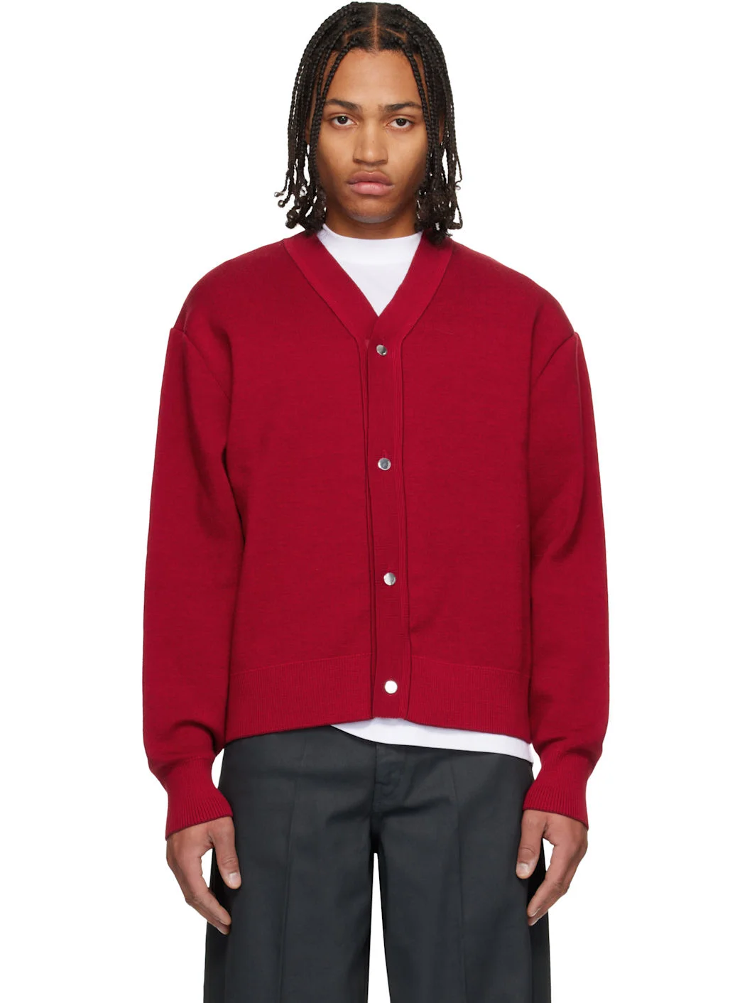 Double-knit merino wool-blend cardigan. · Rib-knit Y-neck, hem, and cuffs · Button closure · Dropped shoulders · Logo-engraved silver-tone hardware Supplier color: Red 94% merino wool, 6% polyamide. Made in Portugal 252553M200005