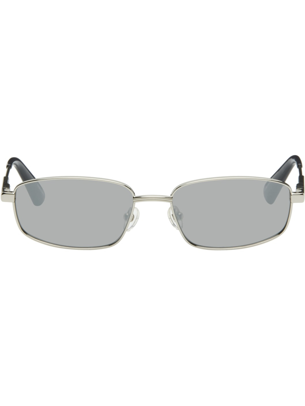 Rectangular stainless steel-frame sunglasses. · Mirrored gray lenses · 100% UVA/UVB protection, category 3 · Adjustable rubber nose pads · Logo etched at temples · Navy acetate temple tips · Includes pouch · Size: 56.17 140 Supplier color: Silver Stainless steel. Made in Japan 252553M134002