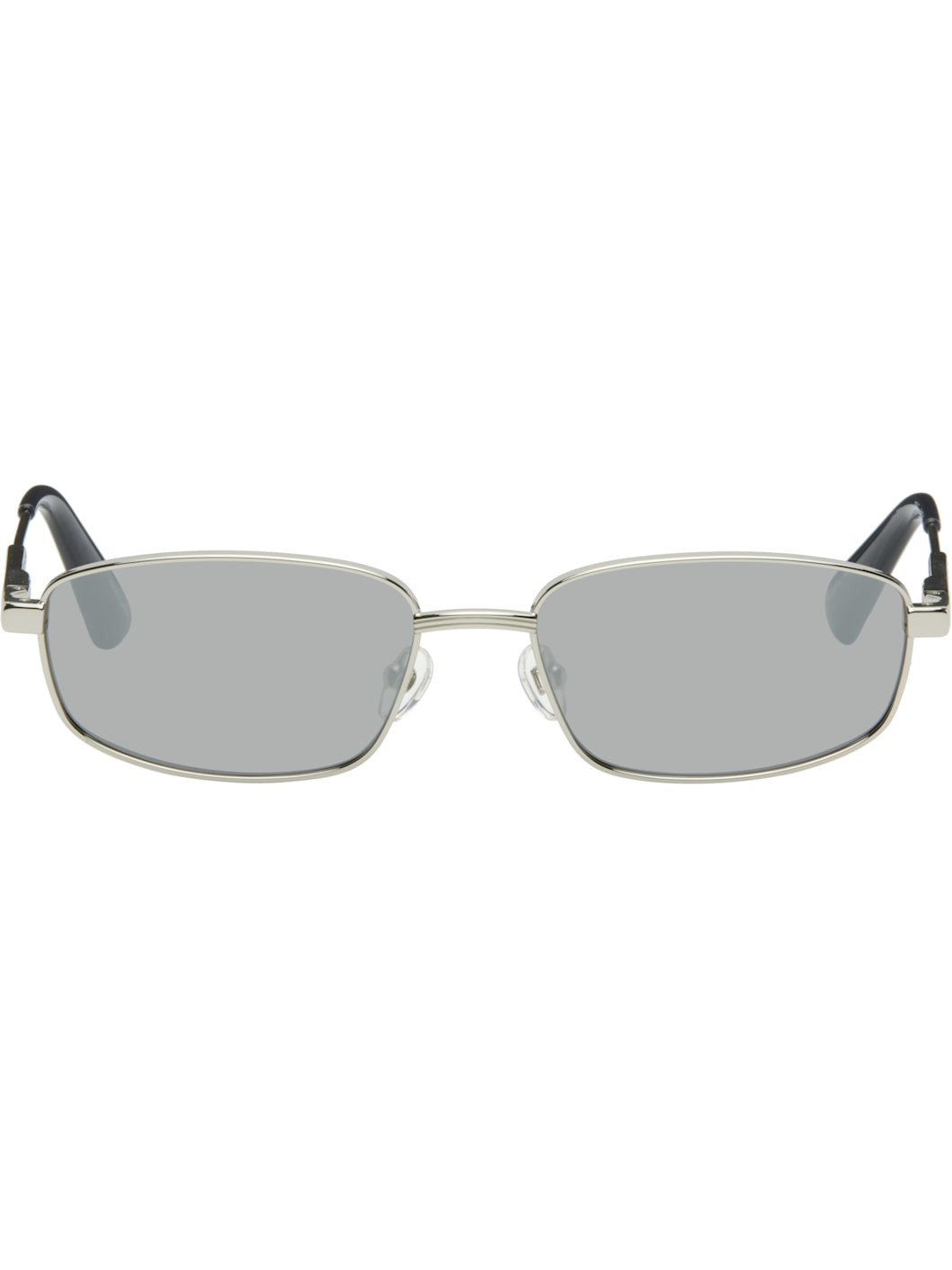 Rectangular stainless steel-frame sunglasses. · Mirrored gray lenses · 100% UVA/UVB protection, category 3 · Adjustable rubber nose pads · Logo etched at temples · Navy acetate temple tips · Includes pouch · Size: 56.17 140 Supplier color: Silver Stainless steel, acetate. Made in Japan 252553F005004