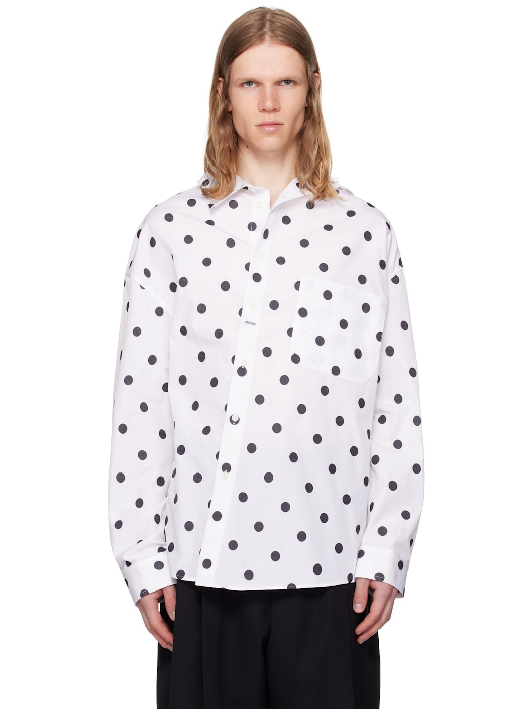 Cotton poplin shirt. Jacquard polka-dot pattern throughout. · Asymmetric construction · Spread collar · Offset button closure · Patch pocket at chest · Shirttail hem · Buttoned barrel cuffs · Locker loop at back collar · Mother-of-pearl hardware Part of the La Croisiere collection. Supplier color: Jacquard dots 100% cotton. Made in Bulgaria 251553M192029