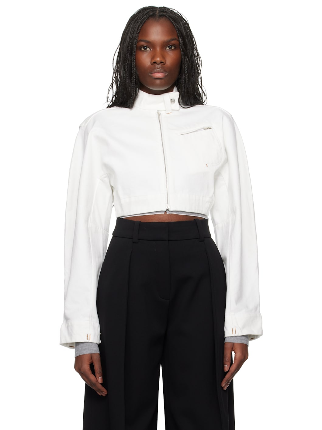 Non-stretch denim jacket. · Belt loop and press-stud fastening at stand collar · Zip closure · Zip pocket at chest · Cropped hem · Yoke sleeves · Belt loop and press-stud fastening at cuffs · Zip vent at cuffs · Locker loop at back collar · Logo-engraved silver-tone hardware · Contrast stitching in tan Part of the La Casa collection. Supplier color: Off-white 100% cotton. Made in Italy 242553F060001