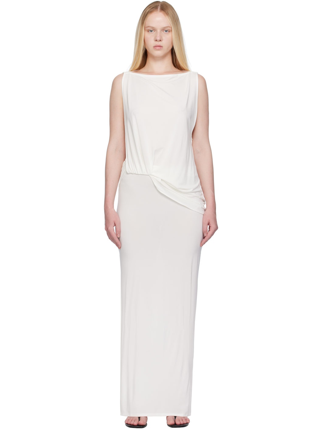 Stretch viscose-blend jersey maxi dress. · Draping throughout · Boatneck · Concealed elasticized waistband · Slit at hem · Dropped armscyes Part of the La Croisiere collection. Supplier color: White 71% viscose, 21% polyester, 8% elastane. Made in Portugal 251553F055010