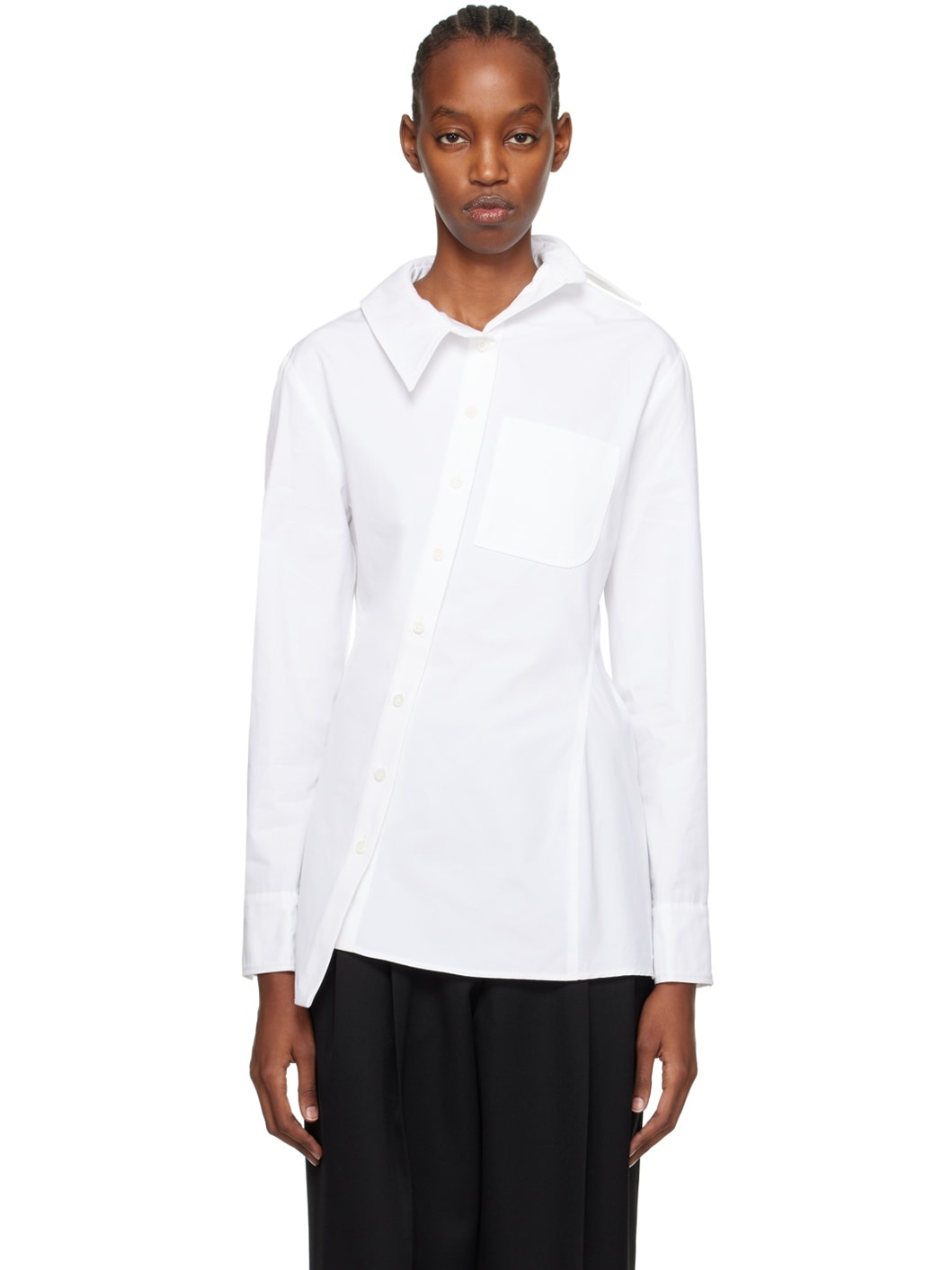 Cotton poplin shirt. · Asymmetrical construction · Pointed collar · Offset button closure · Patch pocket · Single-button barrel cuffs · Logo locker loop at back collar · Box pleat at back yoke · Mother-of-pearl hardware Part of the Les Sculptures collection. Supplier color: White 100% cotton. Made in Bulgaria 241553F109011